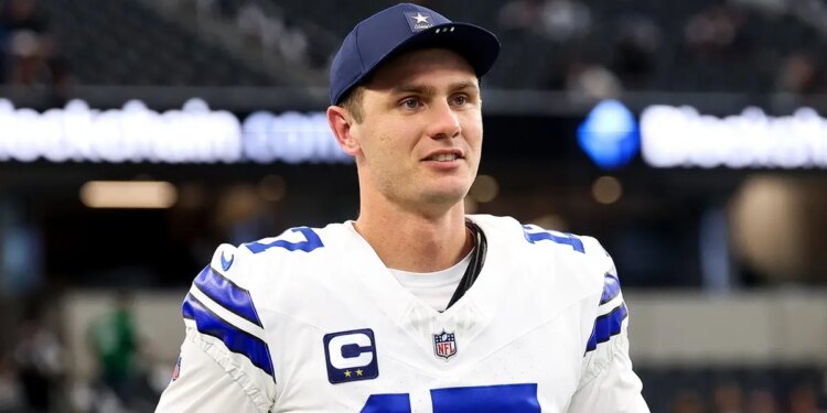 Dallas Cowboys’ kicker Brandon Aubrey looks on during warm-ups before the game against the Philadelphia Eagles at AT&T Stadium in Arlington, Texas, on Nov. 23, 2025. (Kevin Jairaj/Imagn Images)