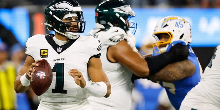 Philadelphia Eagles quarterback Jalen Hurts (1) prepares to throw a pass during the first half of an NFL football game against the Los Angeles Chargers, Monday, Dec. 8, 2025, in Inglewood, California. (AP Photo/Caroline Brehman)