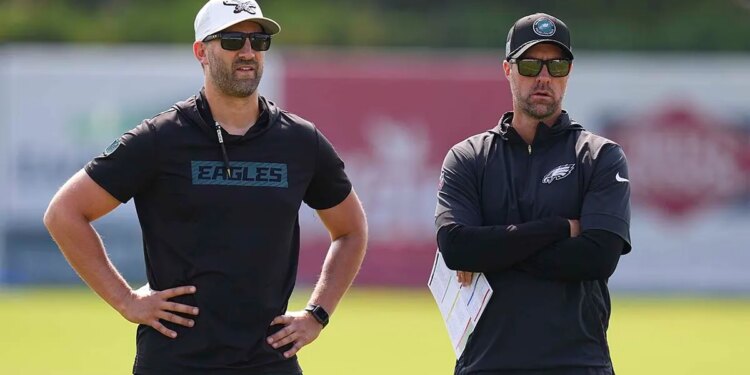 Philadelphia Eagles head coach Nick Sirianni and offensive coordinator Kevin Patullo look on during Training Camp at NovaCare Complex on Aug, 4, 2025 in Philadelphia, Pennsylvania. (Mitchell Leff/Getty Images)