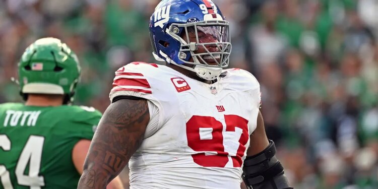 New York Giants defensive tackle Dexter Lawrence plays against the Philadelphia Eagles at Lincoln Financial Field in Philadelphia, Pennsylvania, on Oct. 26, 2025. (Eric Hartline/Imagn Images)