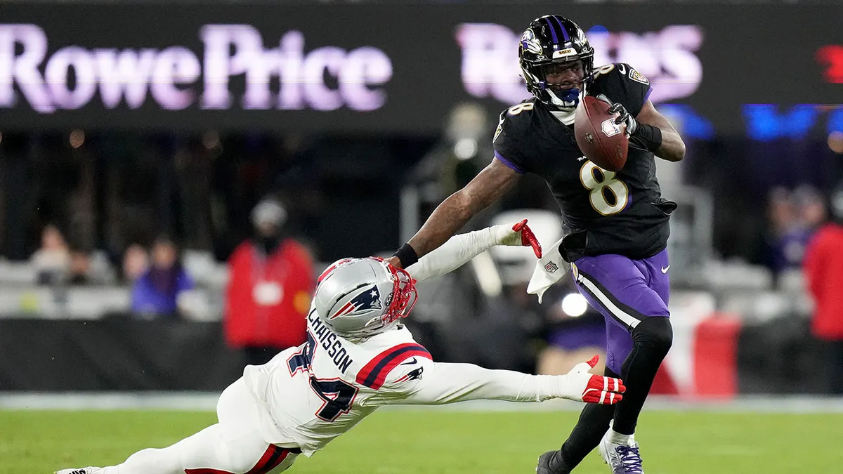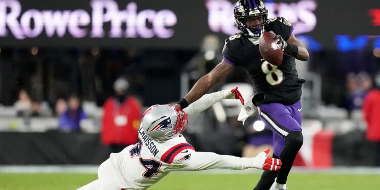 Baltimore Ravens quarterback Lamar Jackson (8) runs against New England Patriots linebacker K’Lavon Chaisson during the first half of an NFL football game, Sunday, Dec. 21, 2025, in Baltimore. (AP Photo/Stephanie Scarbrough)