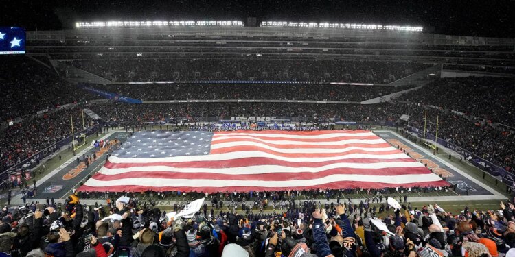 A general view of an American flag on the field before the game between the Chicago Bears and the Los Angeles Rams in the NFC Divisional Playoffs at Soldier Field on Jan. 18, 2026 in Chicago, Illinois. (Patrick McDermott/Getty Images)