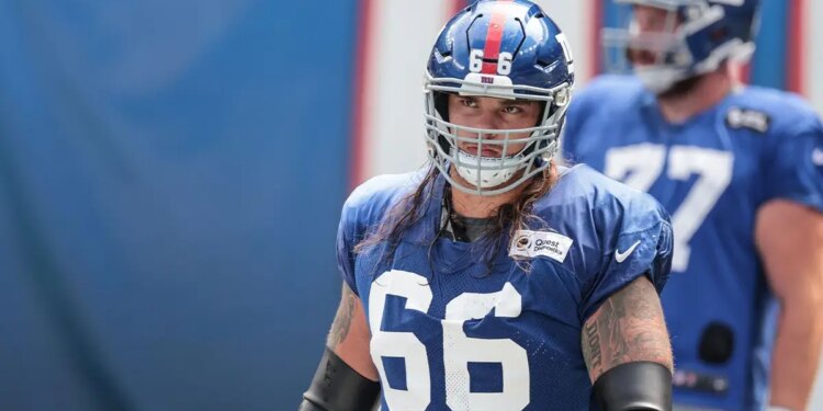 New York Giants guard Shane Lemieux (66) during the Blue-White Scrimmage at MetLife Stadium. (Vincent Carchietta-Imagn Images)