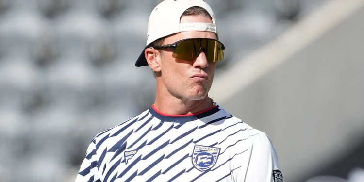 Founders FFC quarterback Tom Brady during the Fanatics Flag Football Classic at BMO Stadium in Los Angeles March 21, 2026. (Kirby Lee/Imagn Images)