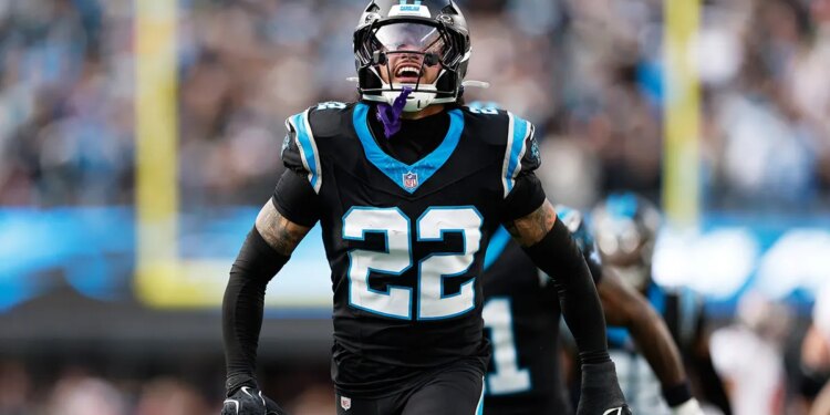 Panthers safety Lathan Ransom celebrates after an interception against the Tampa Bay Buccaneers, Sunday, Dec. 21, 2025, in Charlotte, North Carolina. (AP Photo/Rusty Jones)