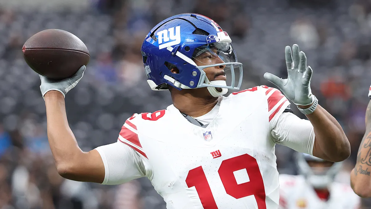 Jameis Winston of the New York Giants warms up prior to the game against the Las Vegas Raiders at Allegiant Stadium on Dec. 28, 2025 in Las Vegas, Nevada. (Ian Maule/Getty Images)