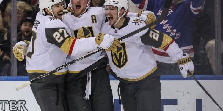 Jack Eichel scored on an end-to-end rush with eight seconds left in overtime after Tomas Hertl scored the tying goal with 52 seconds left in the third period as the visiting Vegas Golden Knights rallied for a 3-2 victory over the New York Rangers on Sunday night.