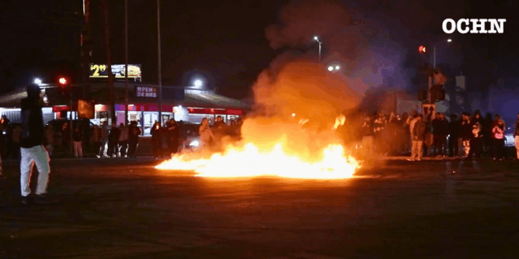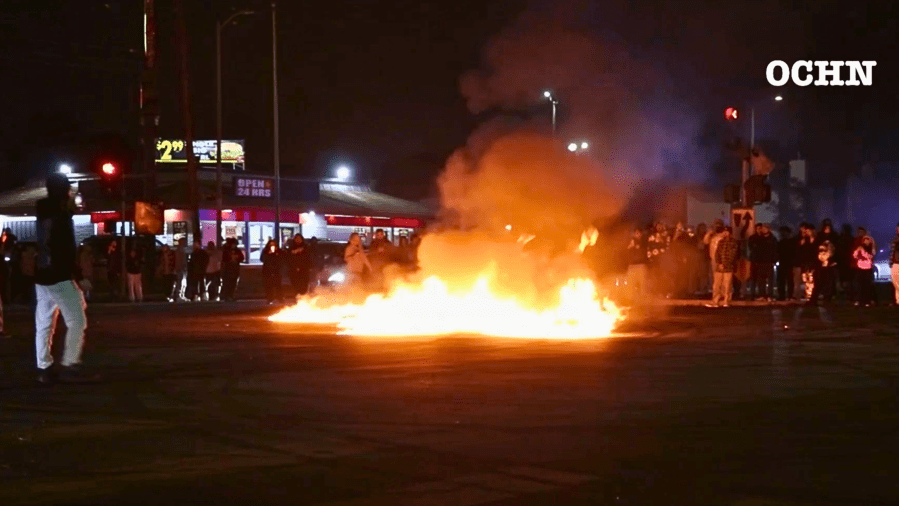 A fire erupted during another street takeover at Sepulveda Boulevard and Plummer Street in the North Hills neighborhood.
