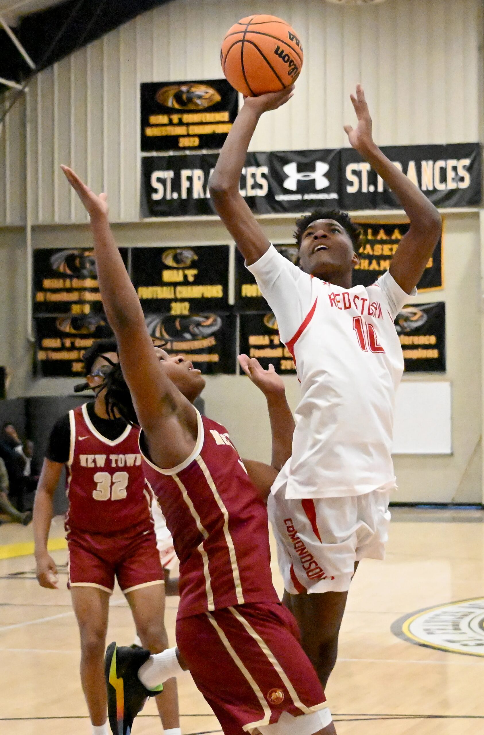 Edmondson’s Jordan Andrews attempts a layup as New Town’s Mekhi Moe and Chase Dennis watch in the first half of a boys basketball game in the St Frances mixer tournament. (Kim Hairston/staff)