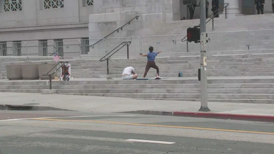 The “No Kings Day” protest in DTLA, however, seemed to start off with tranquility as two people were seen doing yoga on the steps of Los Angeles City Hall around 6:30 a.m. Saturday, June 14, 2025. Near the man and woman doing yoga was a sign with the “No Kings” insignia. (KTLA)