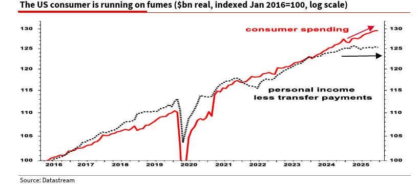While aggregate consumer spending appears to be growing at a healthy rate of nearly 3%, he highlighted that the growth is fundamentally hollow, entirely unsupported by real personal disposable income, which has remained flat for the last six months. Instead, Americans are surviving by draining their savings.