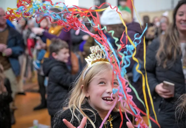 Robin Atwater-Brady, 6 of Halethorpe jumps while holding hands with her mother Hallie Atwater of Halethorpe during the Noon Year’s Eve ball drop, a kid-friendly celebration to ring in 2026 held at B&O Railroad Museum. (Karl Merton Ferron/Staff)Josiah Syler, 3 of the southern Maryland town of Valley Lee blows into his noise maker during the Noon Year’s Eve ball drop, a kid-friendly celebration to ring in 2026 held at B&O Railroad Museum. (Karl Merton Ferron/Staff)Brooklynn Oswald 7 of Gloucester City, N.J. poses for mom Brianna Baylor during the Noon Year’s Eve ball drop, a kid-friendly celebration to ring in 2026 held at B&O Railroad Museum. (Karl Merton Ferron/Staff)