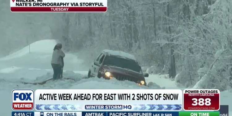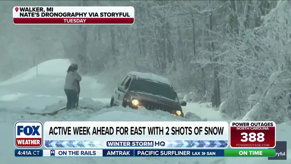 The FOX Forecast Center is monitoring two chances for snow across the East. The first arrives as a weak swath of snow in the Ohio Valley and then a much larger clipper this week for the Northeast. Widespread snow squalls and sudden visibility reductions are possible late Friday, increasing the potential for travel impacts despite generally modest snowfall totals.