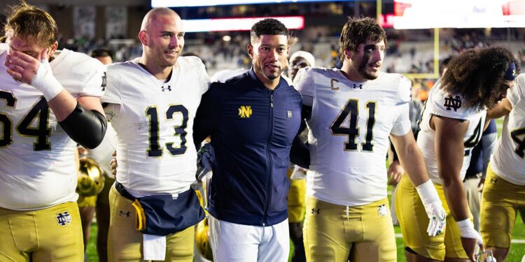 Notre Dame Fighting Irish head coach Marcus Freeman, Notre Dame Fighting Irish quarterback CJ Carr (13) and Notre Dame Fighting Irish defensive lineman Donovan Hinish (41) after the game against the Boston College Eagles at Alumni Stadium on Nov. 1, 2025. (Edward Finan/Imagn Images)