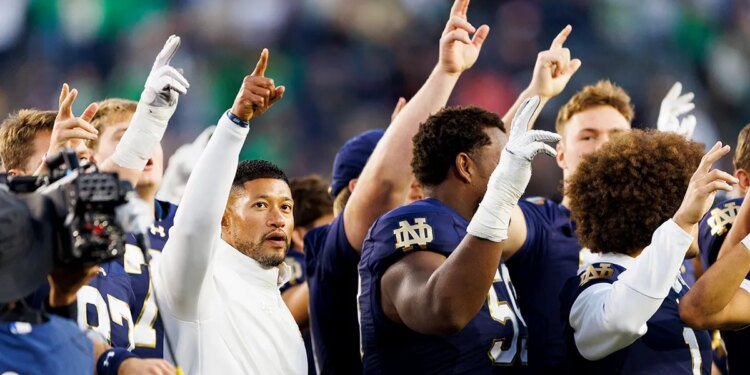 Notre Dame head coach Marcus Freeman celebrates with his players after winning a NCAA football game 36-7 against NC State at Notre Dame Stadium on Saturday, Oct. 11, 2025, in South Bend, Indiana. (MICHAEL CLUBB/SOUTH BEND TRIBUNE / USA TODAY NETWORK via Imagn Images)