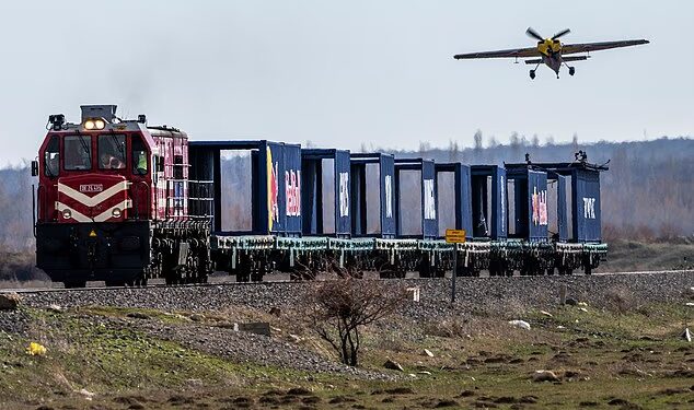 In the footage, shared online, the nine–carriage train can be seen travelling at top speed through the Turkish countryside while Mr Costa flies his plane overhead.
