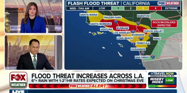 The NWS’ Weather Prediction Center issued a rare Level 4 out of 4 “High Risk” of flash flooding for places just north of Los Angeles in Santa Clarita, Burbank and Glendale through Christmas morning. Los Angeles itself is under a Level 3 flood threat, as the region, home to more than 12 million people, prepares for a widespread 3-5 inches of rain within a 24-hour period.