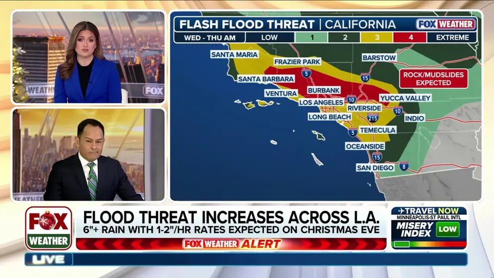 Officials in Los Angeles are warning people about the imminent potential for life-threatening flooding Wednesday, asking people to stay aware as they celebrate Christmas Eve. The National Weather Service has issued the highest flash flood risk for parts of Los Angeles, Ventura and Santa Barbara counties through Wednesday. A powerful storm is moving onshore after days of rain have saturated soils, creating prime conditions for dangerous flooding. Mudslides and debris slides are expected, according to the NWS.
