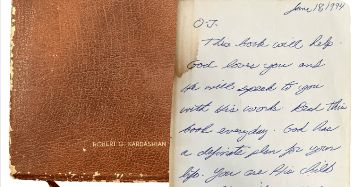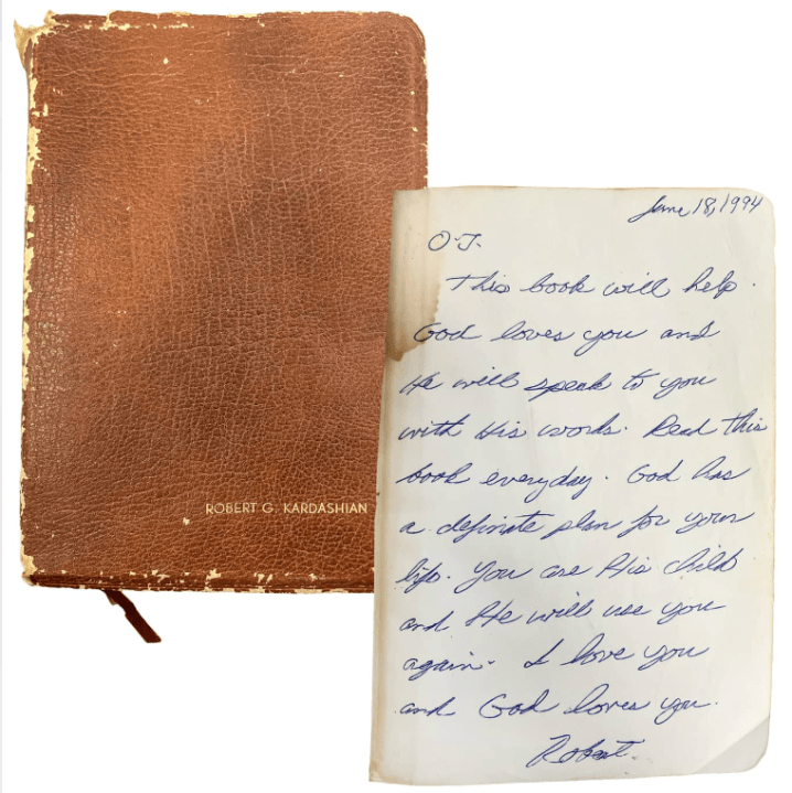 “A token of friendship and support, during a tumultuous period of late Hall of Famer O.J. Simpson’s life, Simpson’s friend and lawyer, the late Robert Kardashian, gifted this personalized copy of ‘The Living Bible’ to Simpson, leaving a heartfelt inscription dated June 18, 1994, the day after the infamous Ford Bronco chase,” the description reads on the site. “The decades-long friendship between Kardashian and Simpson began during the late 1960s while both were students at USC and continued as both men found fame and success in their lives, with Simpson serving as the best man at Kardashian and Kris Houghton’s wedding during the late 1970s.”
