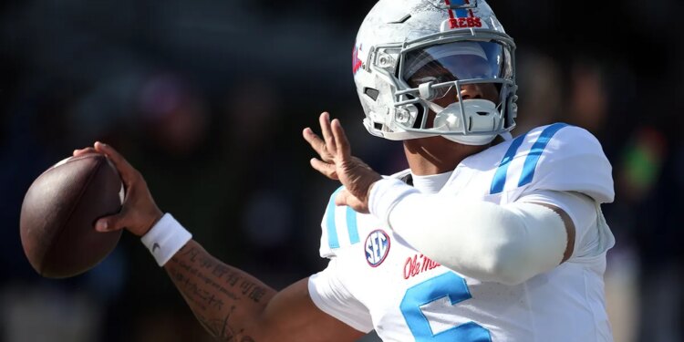 Mississippi Rebels quarterback Trinidad Chambliss warms up before a game against the Mississippi State Bulldogs at Davis Wade Stadium at Scott Field Nov. 28, 2025. (Petre Thomas/Imagn Images)