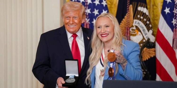 Kaillie Humphries, a U.S. Olympic bronze medalist bobsled athlete, presents the Order of Ikkos to President Donald Trump during a Women’s History Month event in the East Room of the White House in Washington, D.C., March 12, 2026. (Al Drago/Bloomberg)