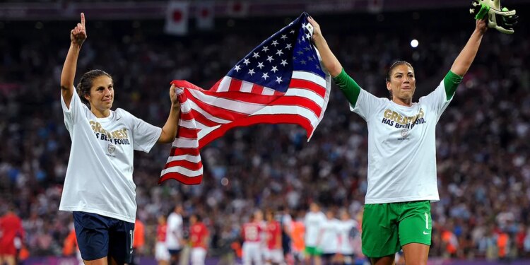 Hope Solo (1) and Carli Lloyd (10) of the United States celebrate with the American flag after defeating Japan 2-1 to win the women’s football gold medal match on day 13 of the London 2012 Olympic Games at Wembley Stadium in London, England, on Aug. 9, 2012. (Michael Regan/Getty Images)