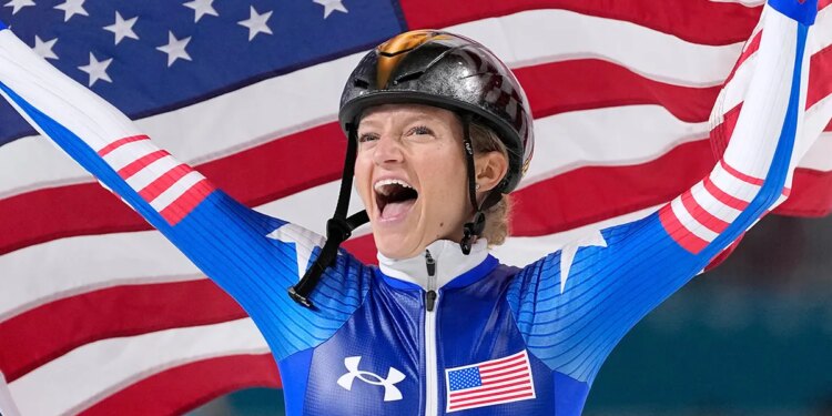 Mia Manganello of the U.S. celebrates winning the bronze medal in the women’s mass start final speedskating race at the 2026 Winter Olympics. Milan, Italy, on Feb. 21, 2026. (Ben Curtis/AP Photo)