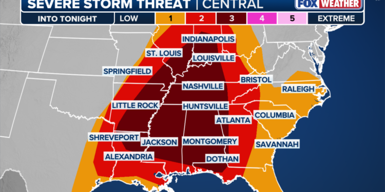 “While the moisture isn’t exceptionally deep, the sheer speed of the winds aloft is enough to overcome that limitation,” the FOX Forecast Center said. “As a result, a widespread line of intense thunderstorms, known as a squall line, is expected to form along a cold front and sweep through the Mid-South and Ohio Valley.”