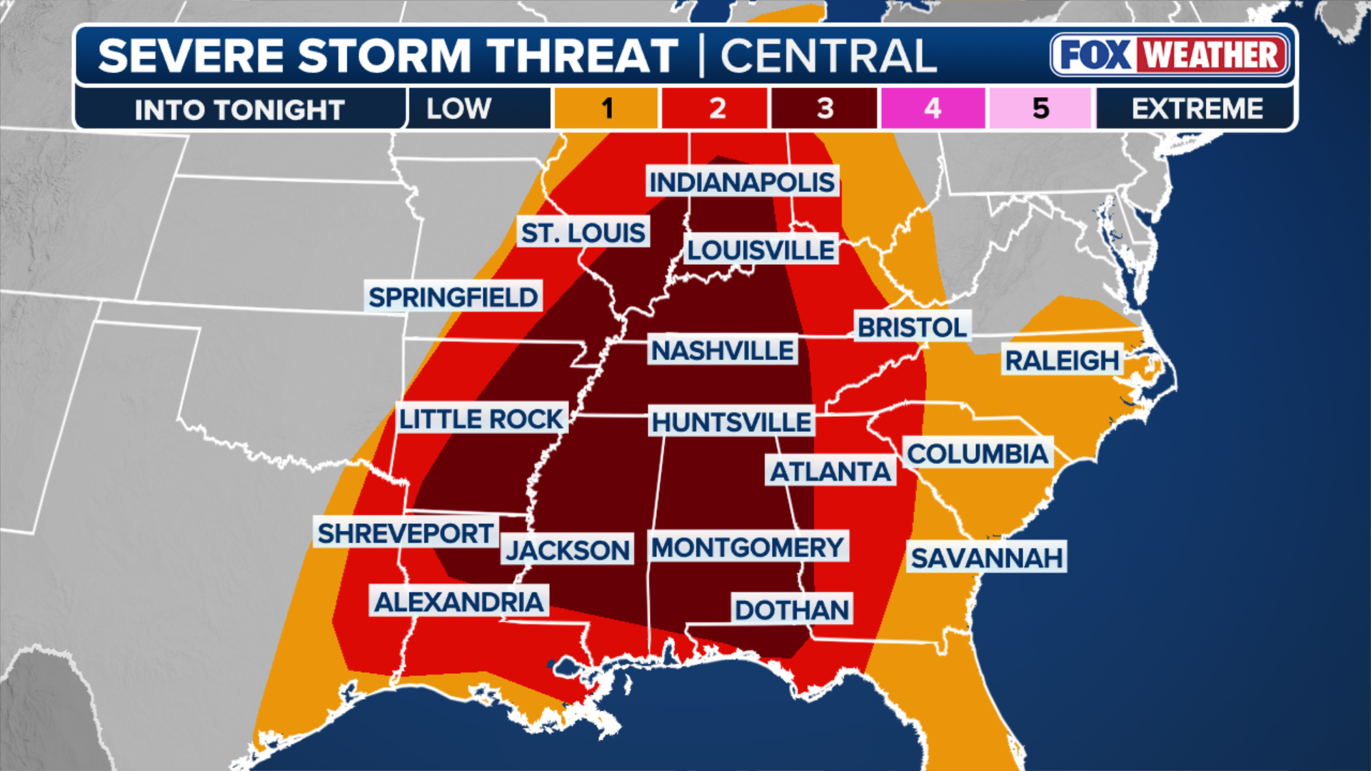 Cities with Level 3/5 severe weather risk include Indianapolis, Memphis, Nashville, Tennessee, Louisville, Kentucky, and Little Rock, Arkansas.