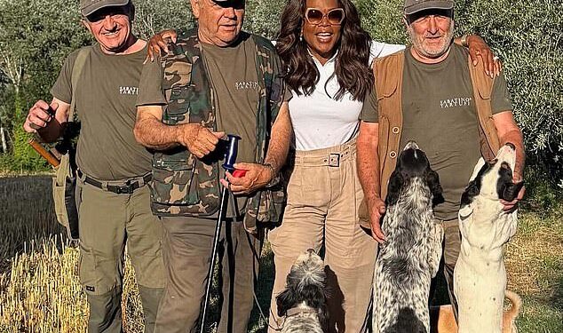 Oprah was wearing sunglasses as she forged ahead in the forest with her party and the hunters. Even though truffles usually grow underground near tree roots, she wasn’t afraid to wear a white top and matching trainers