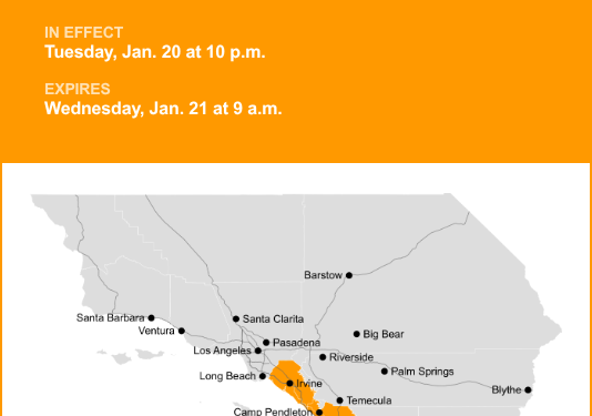 Orange County Coast, Orange County, San Diego County Coastal Areas and San Diego County Inland Valleys are the focus of a dense fog advisory released at 7:12 p.m. on Tuesday by the National Weather Service. The advisory is valid from 10 p.m. until Wednesday Jan. 21, at 9 a.m.