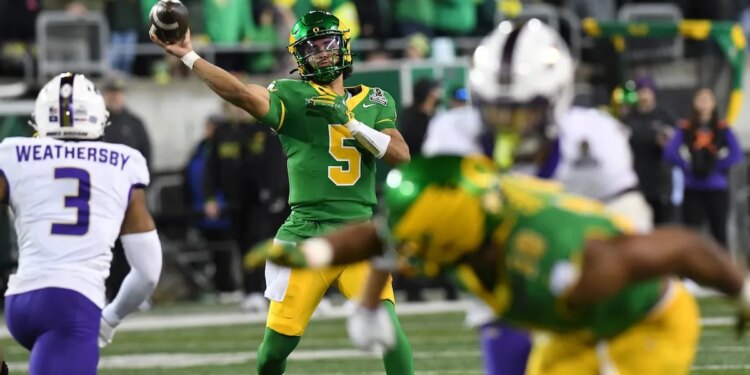 Oregon Ducks quarterback Dante Moore (5) passes for a 20-yard touchdown in the second quarter during the College Football Playoff first round game between the Oregon Ducks and James Madison Dukes on Dec. 20, 2025, at Autzen Stadium in Eugene, Oregon. (Brian Murphy/Icon Sportswire via Getty Images)