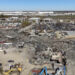 A newly-built housing development – some of the properties yet to be sold – stands at the bottom of the road leading to the camp.