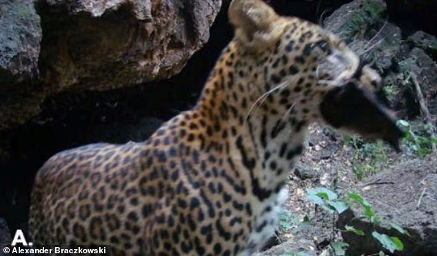 An African leopard seen with its bat prey emerging from Python Cave in Uganda