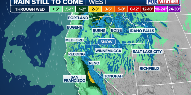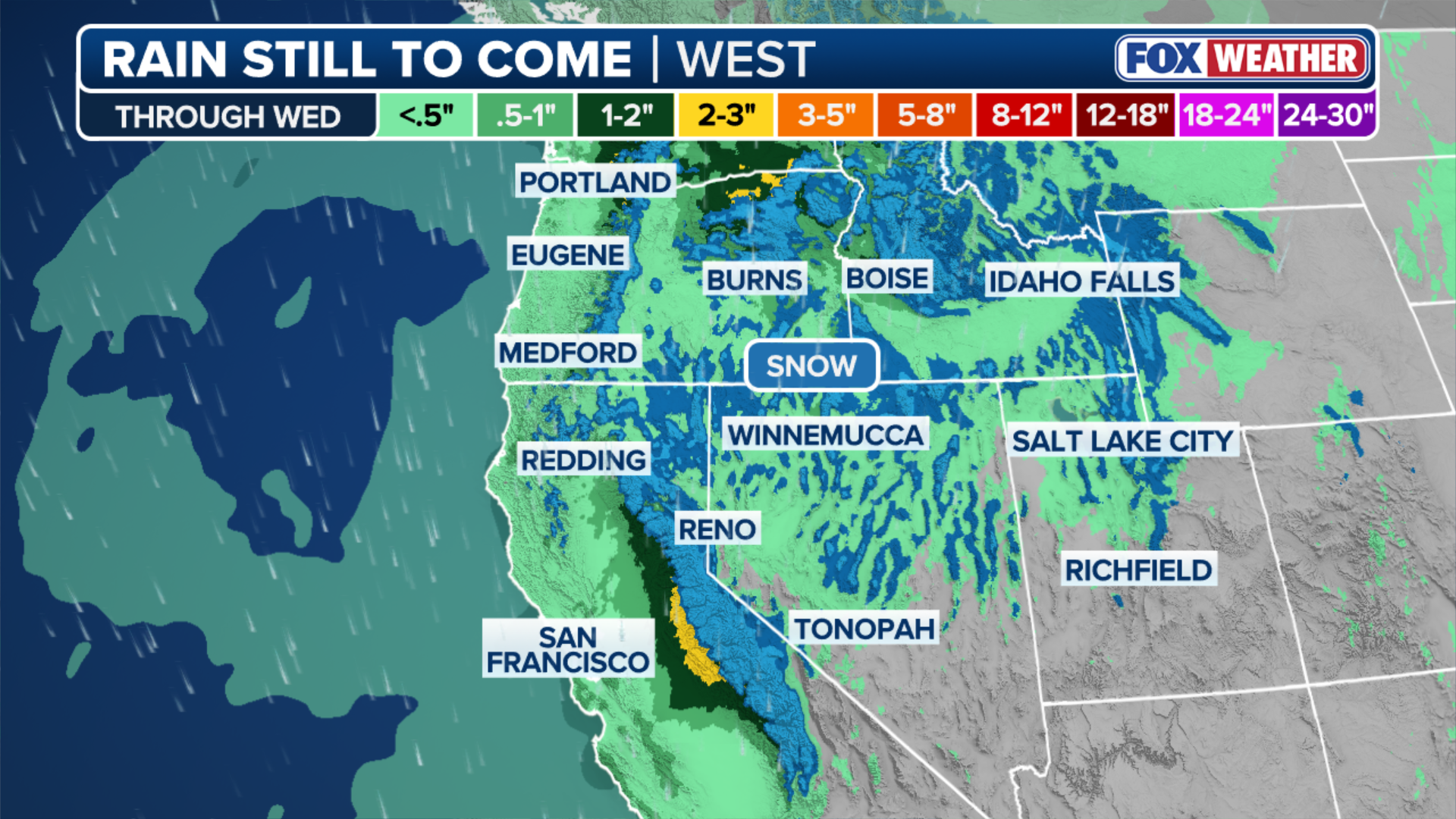 Throughout Wednesday, an additional 1-2+ inches of rain is possible from Redding, California down into the central foothills of the Sierra.
