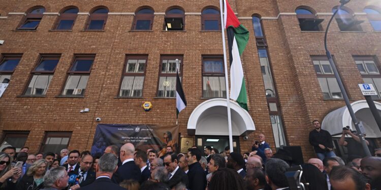 The Palestinian flag has been raised outside the premises of what is now Palestine’s embassy to the United Kingdom in London, marking Britain’s historic and long-awaited recognition of a Palestinian state, as Israel’s relentless destruction of Gaza and its military’s crackdown in the occupied West Bank continue.