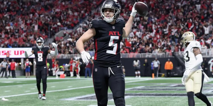 Drake London of the Atlanta Falcons reacts after scoring a touchdown during the first quarter of the game against the New Orleans Saints at Mercedes-Benz Stadium on Jan. 4, 2026 in Atlanta, Georgia. (Kevin C. Cox/Getty Images)