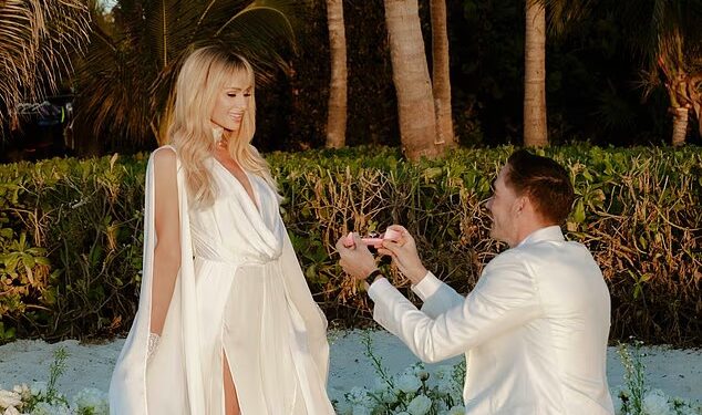 Alongside some behind-the-scenes photos from their big day, Paris – who has Phoenix, three, and London, two, with Carter – wrote on X: ‘Five years later… and he still makes my heart skip a beat [tears and ring emojis]’