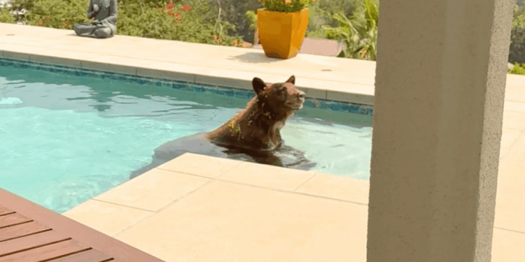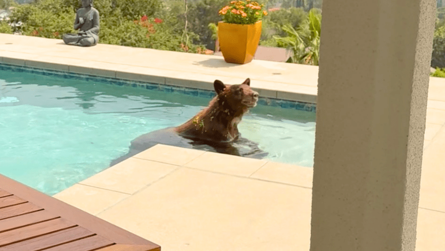 A bear known to residents in the Upper Hastings Ranch area of Pasadena as “Cinnamon” made her first appearance since the deadly Eaton Fire in January by taking a dip in a resident’s pool on Wednesday.