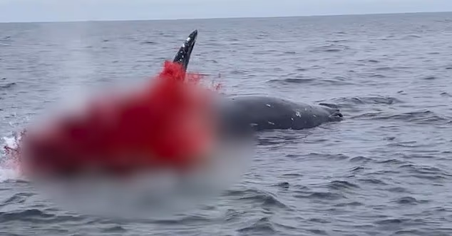 The boat pulled alongside the carcass, spewing water from its mouth and gas trapped in the abdomen vacated, triggering an eruption of its internal organs – including its spleen, small intestines and stomach.