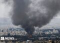 • A person is seen waving a flag atop the Hollywood sign. February 2025. (KTLA)