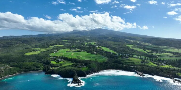 An aerial view of the golf course from over the ocean prior to The Sentry at The Plantation Course at Kapalua on December 31, 2023 in Kapalua, Maui, Hawaii. (Photo by Ben Jared/PGA TOUR) (Ben Jared/PGA TOUR)