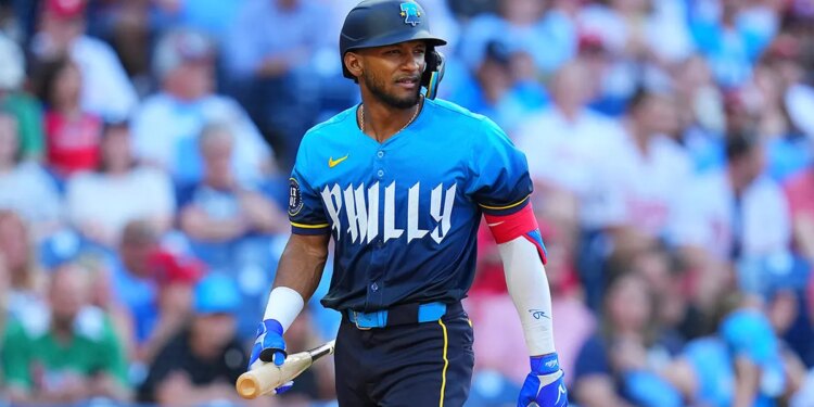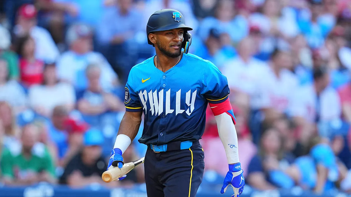 Johan Rojas of the Philadelphia Phillies looks on against the Miami Marlins at Citizens Bank Park on June 28, 2024 in Philadelphia, Pennsylvania. (Mitchell Leff/Getty Images)