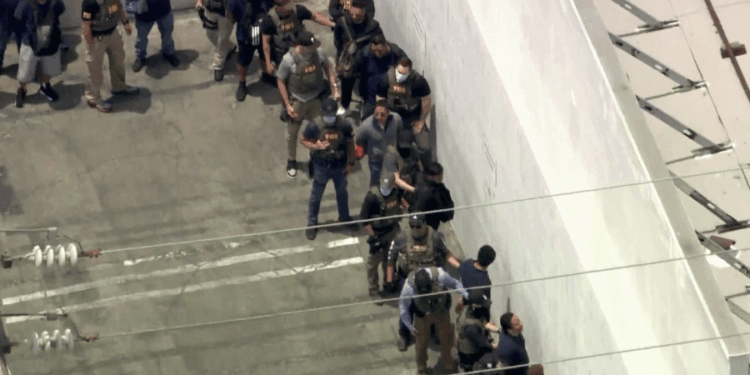 Video from above showed approximately two dozen people being loaded into unmarked white SUVs and taken away from the scene.