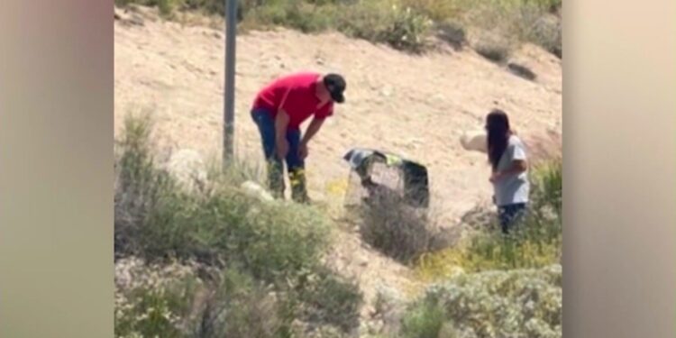 Video footage taken by Lomeli’s friend Kossondra Villasenor showed that the cats did not immediately leave their cage, so the woman tipped the cage on its side to get the cats – four kittens around six weeks old and an adult believed to be their mother – out of the enclosure.
