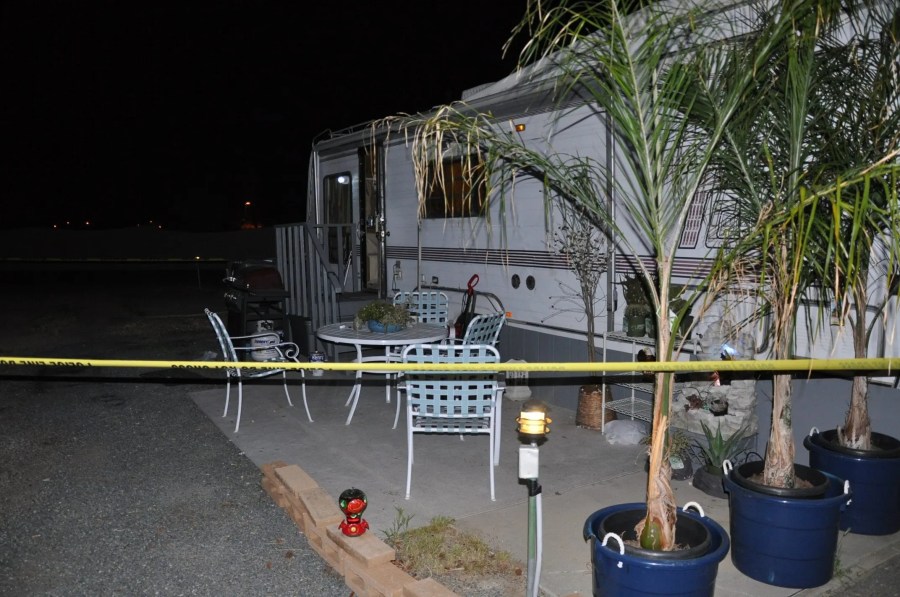 The exterior of the trailer belonging to Dori De Ann Jamison, who was found dead inside on Mar. 22, 2014. (Hemet Police Department)
