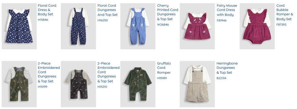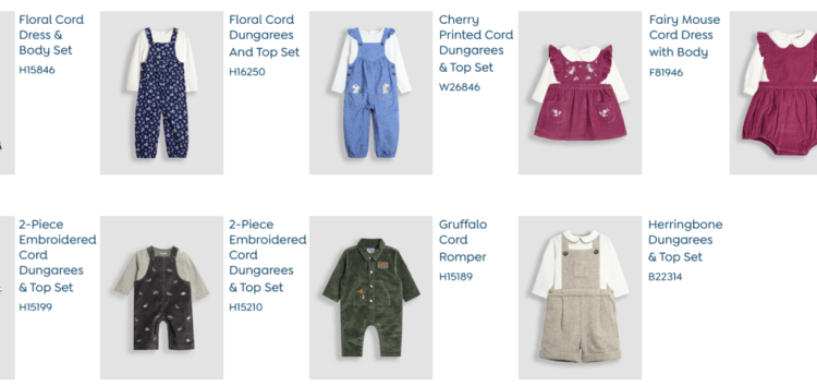 There are also concerns with the embroidered cord dungarees and top set, a Gruffalo cord romper, and a herringbone dungarees and top set.