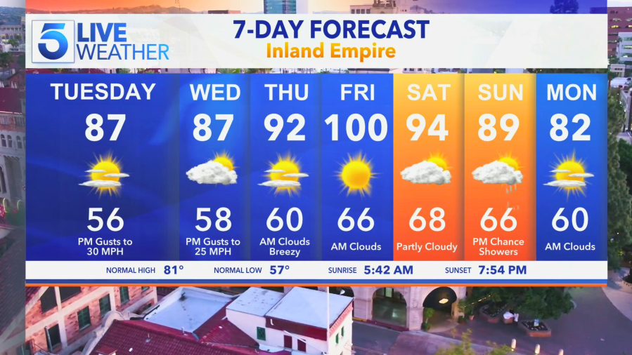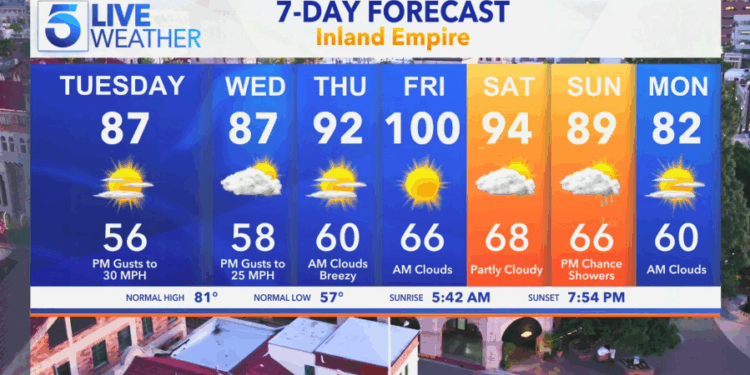 KTLA’s 7-Day outlook for the Inland Empire shows afternoon highs in the 90s by Thursday and reaching 100 degrees on Friday.