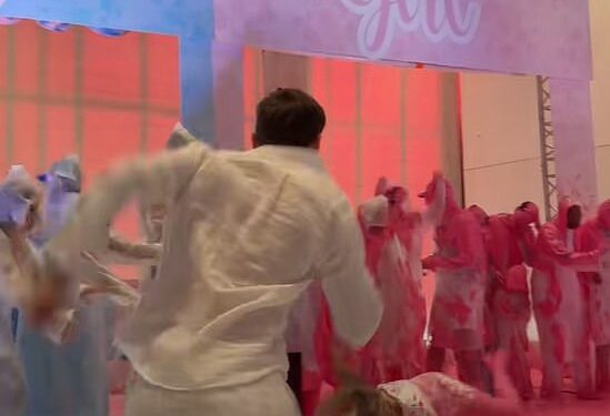As the pink fluid spread across the stage, Lele slipped in it twice and tumbled hard, prompting people nearby to rush to help her as Guaynaa turned around and realized what had happened