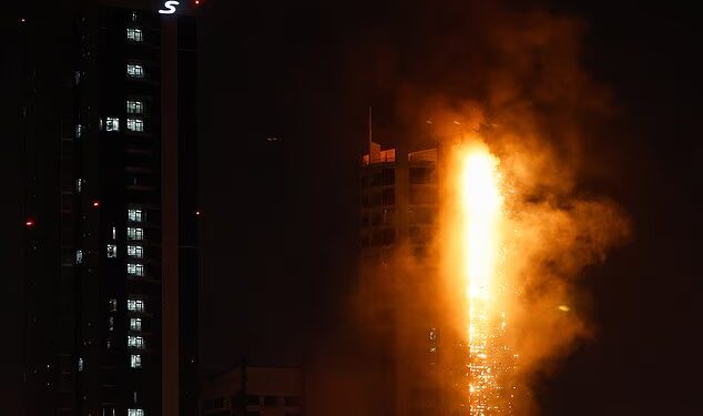 As the conflict in Iran spreads throughout the Middle East, fears are growing that the world may soon spiral into a WWIII. Pictured: smoke rises from a burning building hit by an Iranian drone strike in Bahrain on February 28